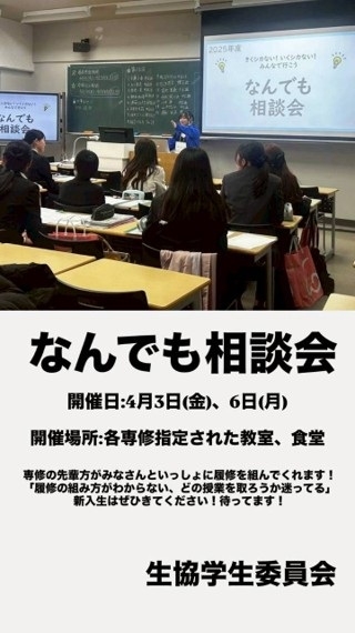 大学では高校生までとは違い、自身で時間割を考えることになります。しかし、今までに経験のない「履修登録」を一人でできるか、不安に思っている人はいませんか?そんなあなたにピッタリな企画がなんでも相談会です。同じ専修の先輩たちに履修登録の仕方やおすすめの一般教養科目、副免許について相談してみませんか?その他にも大学生活の悩みであれば、なんでも相談することができます。悩みを解決して、より良い大学生活をスタートさせましょう。