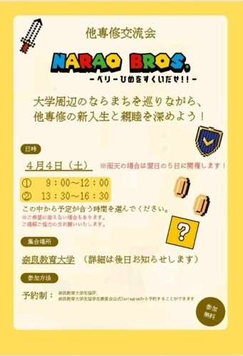 大学生活のスタートにあたって、不安なことや気になることはありませんか?この企画は、そんな新入生の不安や緊張をほぐすような交流の場になっています。みんなで「ならまち」を探索して、楽しい時間を過ごしましょう!